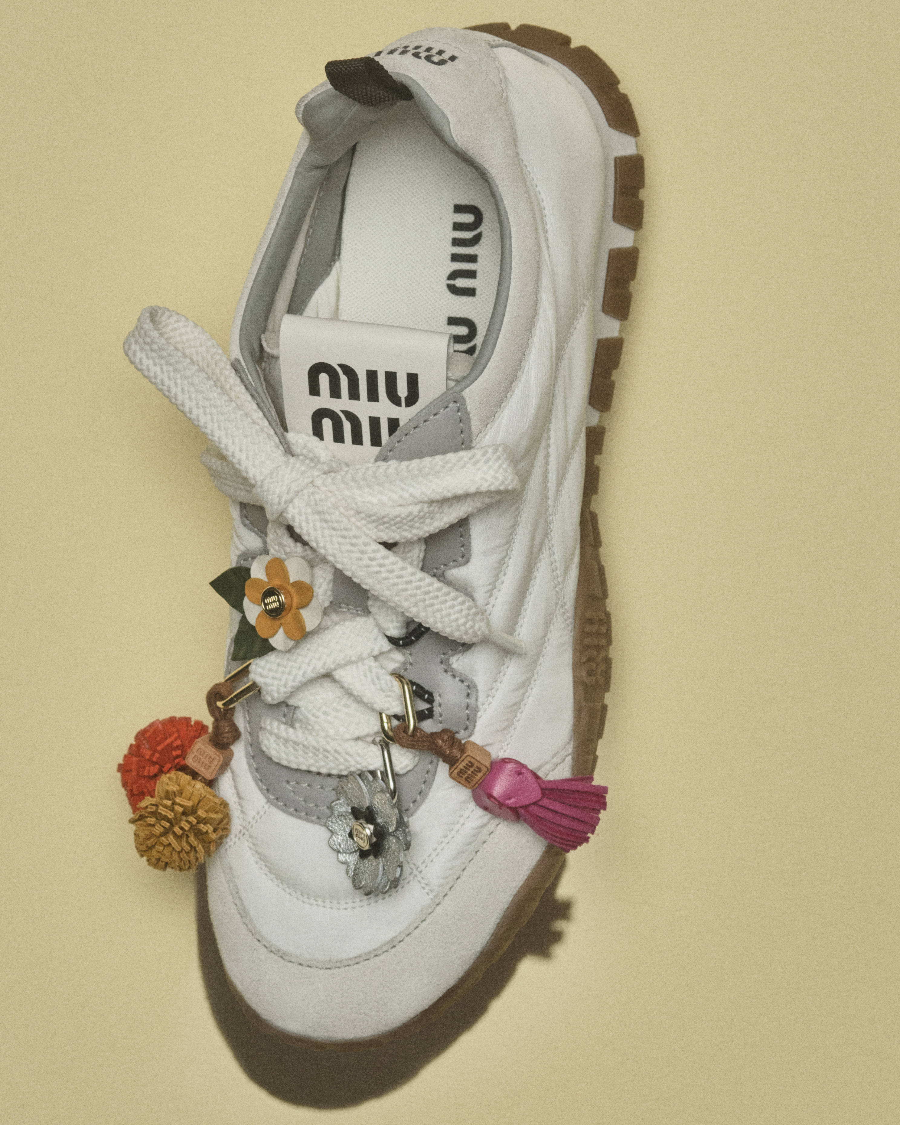 新年伊始,Miu Miu标志性运动鞋自成当季焦点:轻盈的Plume系列携浅褐色全皮革鞋面亮相;Tyre运动鞋取材清爽白色科技面料与麂皮,搭载瞩目天然橡胶鞋底,愈显坚实挺括质感。延续Custom Studio定制项目,邀约顾客随心搭配精选饰件,打造专属独特运动鞋。写意花朵、绒球与流苏装点的精致缀饰成就独一无二的鞋履,承载穿着者期许与梦想的独一无二之作。