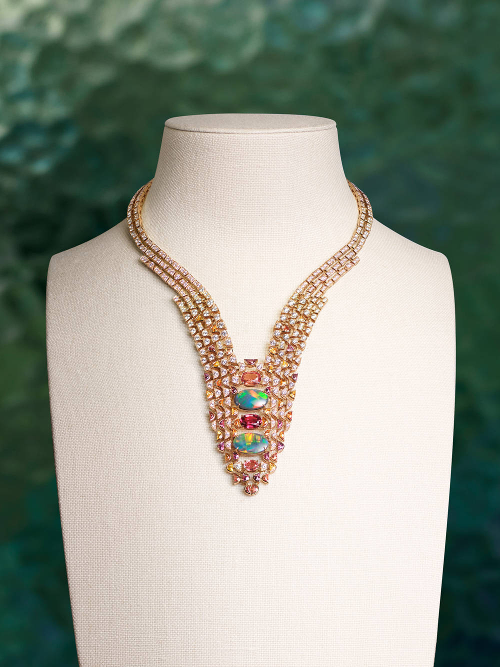 这款项链聚焦一对华美欧泊,通过丰富配色烘托其迷人虹彩。欧泊的红、橙和黄色光芒,与交错排布的三颗彩色蓝宝石相互映衬。一系列Umba蓝宝石的丰富色彩和谐交融,令温暖色调延伸至整件作品,达到精妙平衡。反复排列的几何图案延展成柔美曲线,契合中央宝石的椭圆形轮廓。