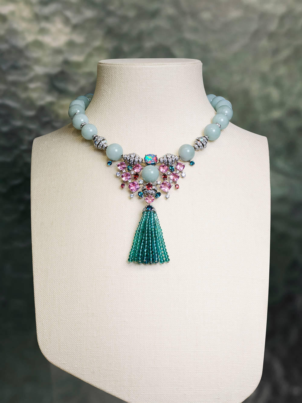 这款项链将一颗梨形蓝宝石与八颗祖母绿巧妙搭配,演绎卡地亚标志性的蓝绿色彩组合───孔雀图案,祖母绿的深邃色调呼应蓝宝石的柔和质感,令整体色彩细腻和谐。作品由一系列几何元素铺展而成,衬托祖母绿的枕形造型。宝石与镶钻图案交替排列,在虚实相间的布局中达至平衡。镂空设计增强了律动感,而方形与锥形钻石构成的几何细节犹如节奏符号,为整体构型注入强烈张力。